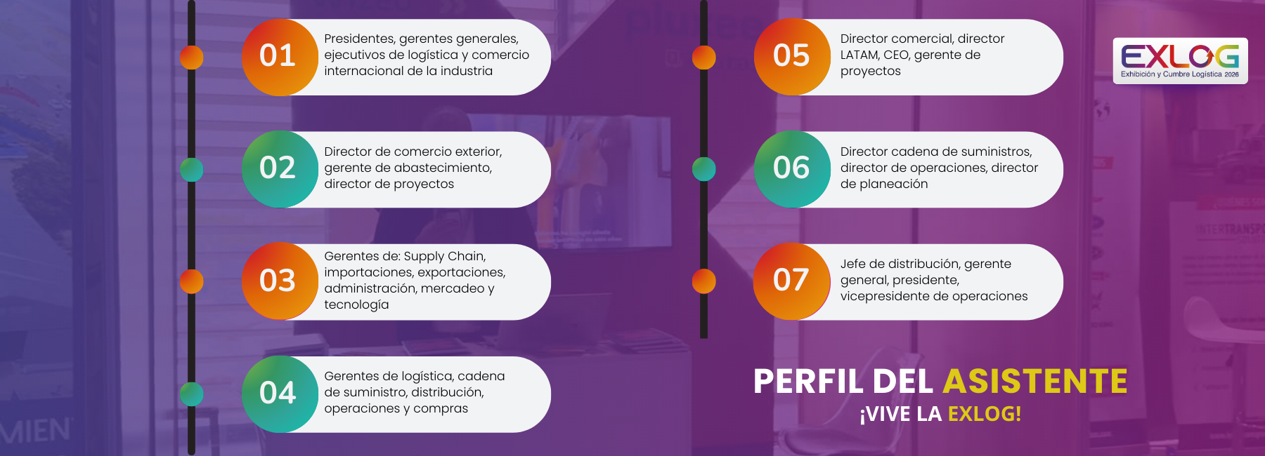Podrá visitar la muestra comercial durante los dos días y acceder a los talleres sectorizados por industria (5 de agosto) los cuales han sido configurados como espacios estratégicos de Exhibición de la logística en Colombia y América Latina, convirtiéndose en el punto de encuentro que busca brindar la mejor experiencia a asistentes y seguidores de las tendencias de la cadena de suministro y la logística.